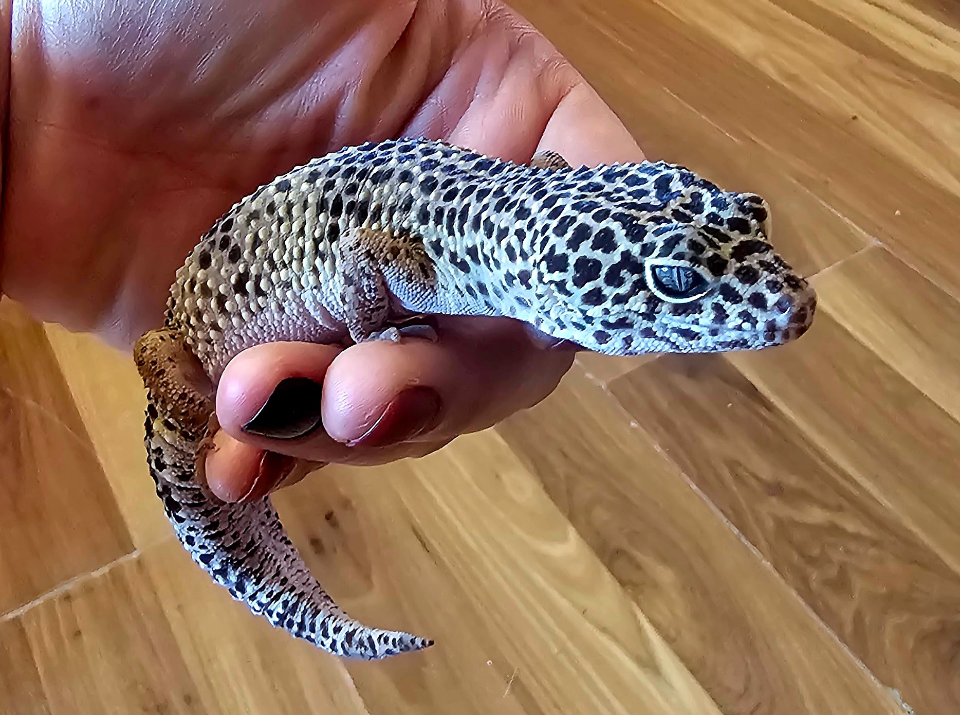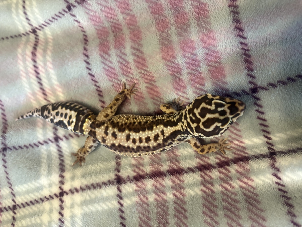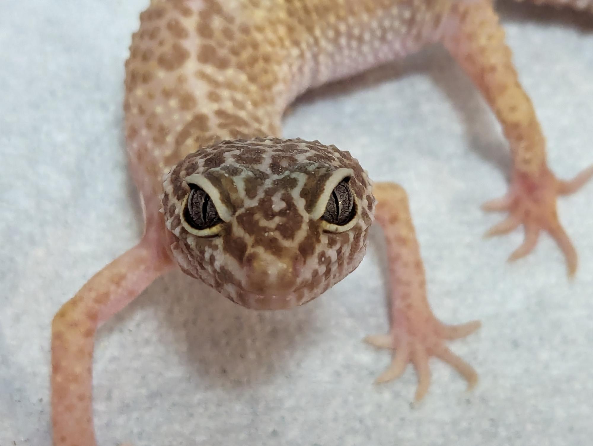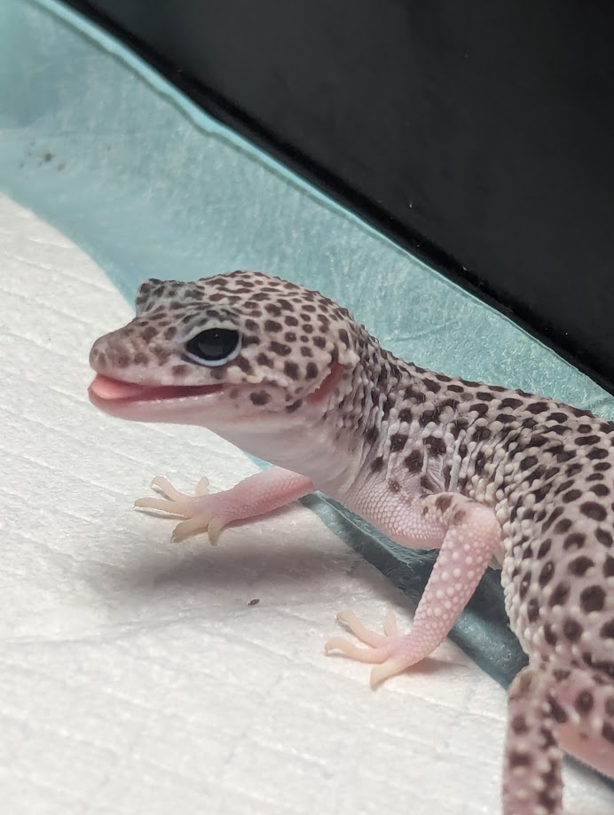 Meet Clyde! Clyde is an outgoing, explorer type leopard gecko. He has a strong personality and tells you when he dislikes something (or doesn’t want to do something). He is a talker and fast to acclimate to new places. Although he likes to be out, he is less into petting and handling. He would rather sit on you or free roam. Clyde would be great for someone who wants a more active gecko. Clyde will need a minimum of a 40 gallon enclosure for adoption.