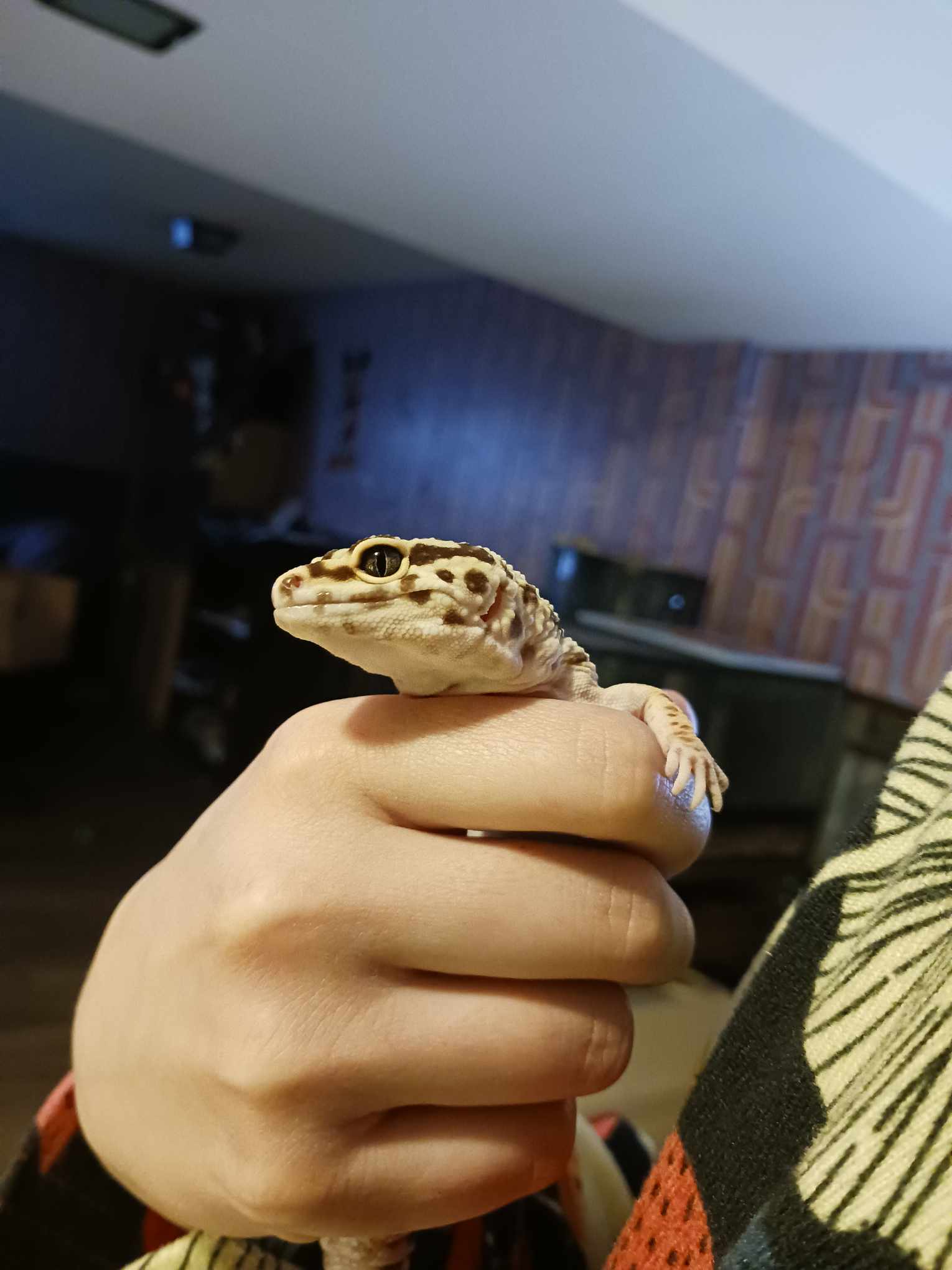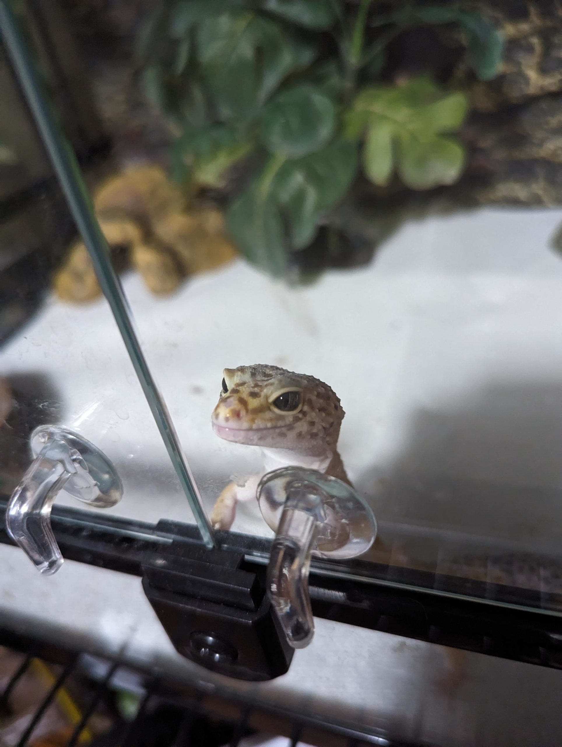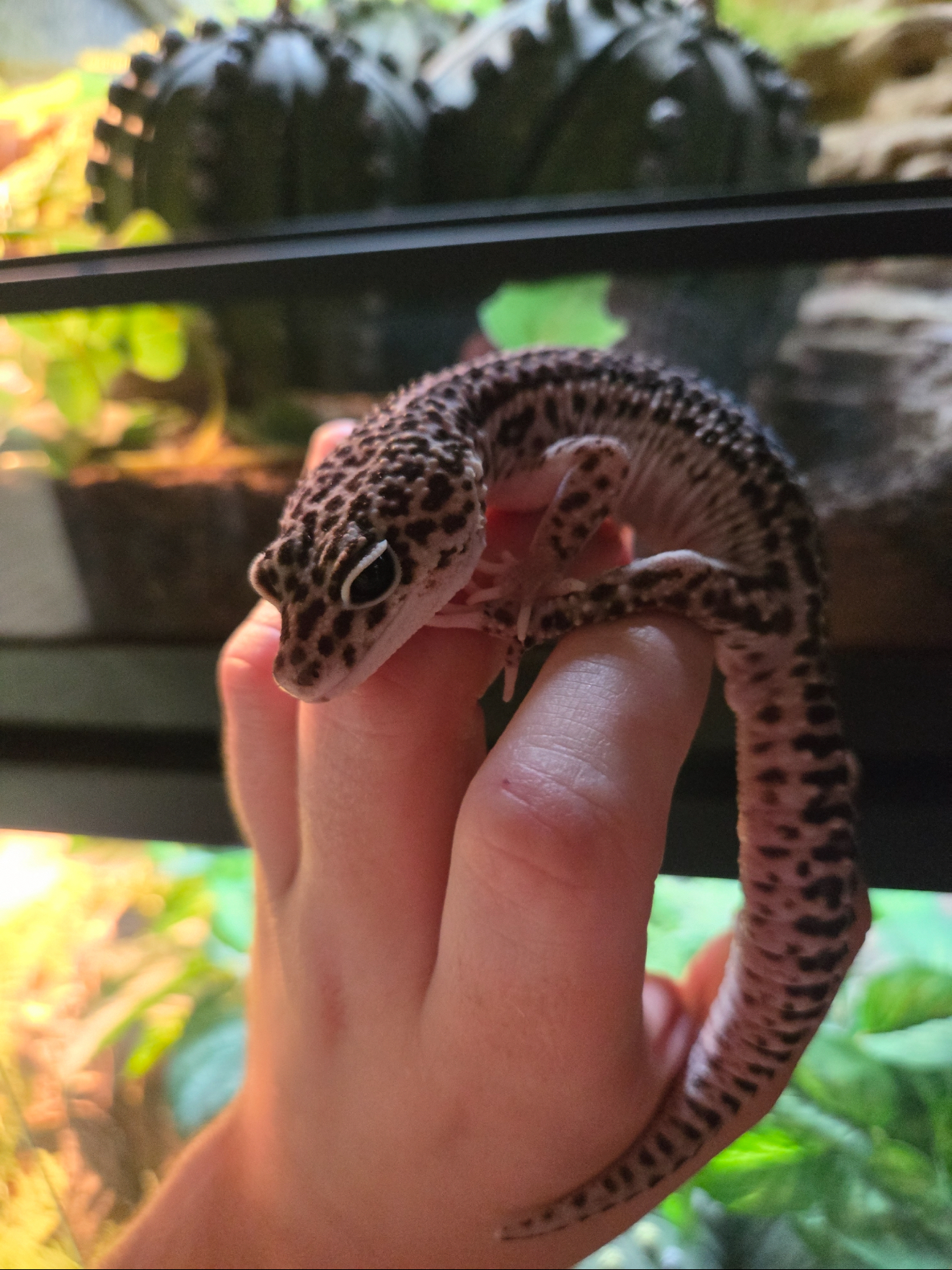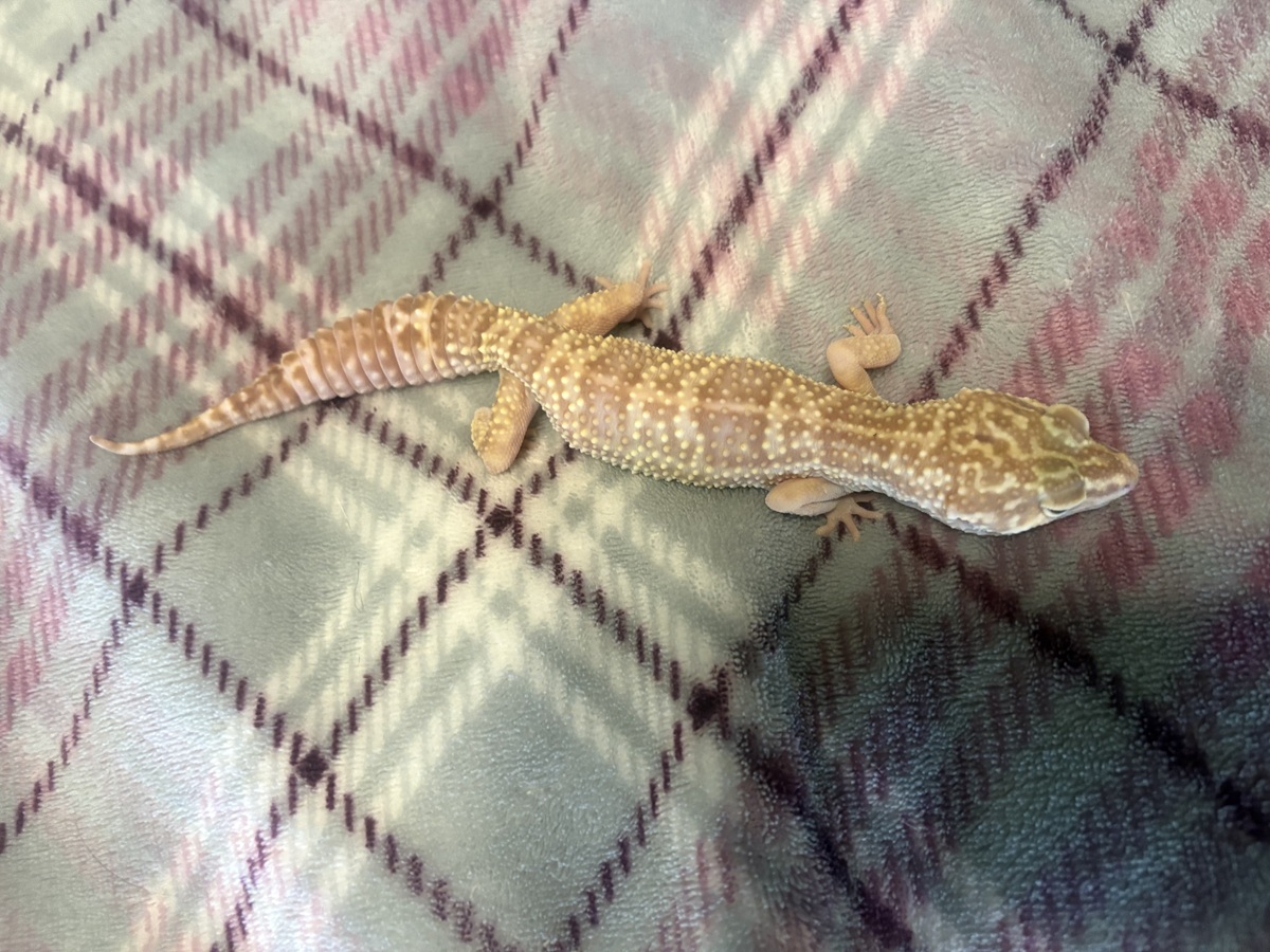 Meet Clyde! Clyde is an outgoing, explorer type leopard gecko. He has a strong personality and tells you when he dislikes something (or doesn’t want to do something). He is a talker and fast to acclimate to new places. Although he likes to be out, he is less into petting and handling. He would rather sit on you or free roam. Clyde would be great for someone who wants a more active gecko. Clyde will need a minimum of a 40 gallon enclosure for adoption.