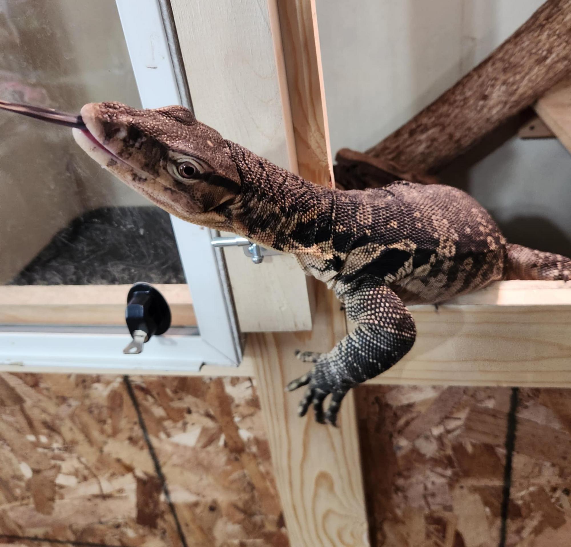 Meet Kaida! Kaida is only available for experienced reptile keepers. Kaida is an asian monitor that needs a little more tlc in the socialization aspect, and tends to be shy at first around new people, but warms up quickly if you allow him to come on his terms. Snacks are an excellent way to his heart. He likes to be tong fed every 2-3 days with a variety of frozen thawed whole pretty items such as rodents or quail, quail eggs, salmon, and tilapia. Kaida may also be adopted with a temporary enclosure as well for $200. He will need to be upgraded a year or two after adoption, so he will be a large commitment.