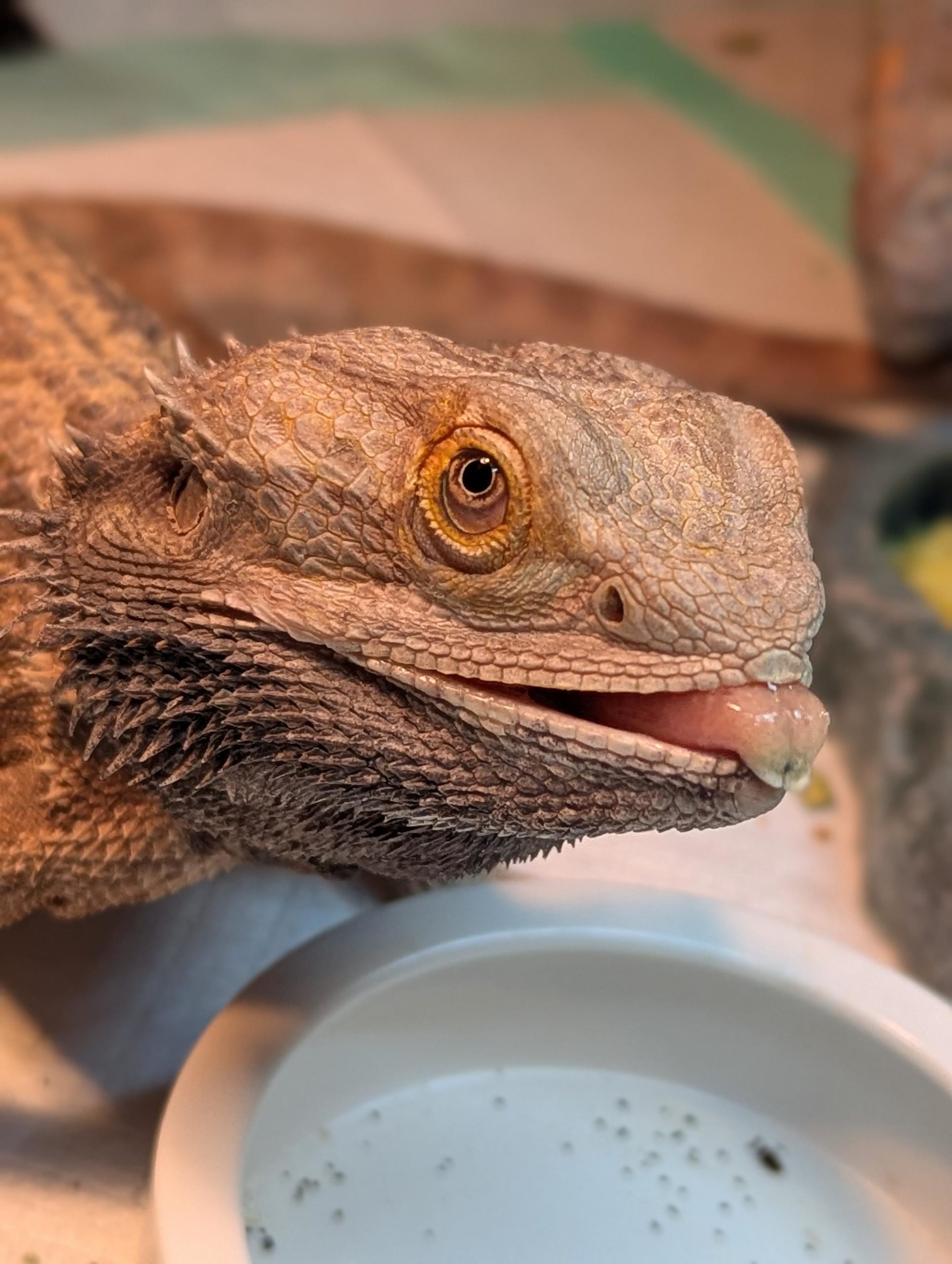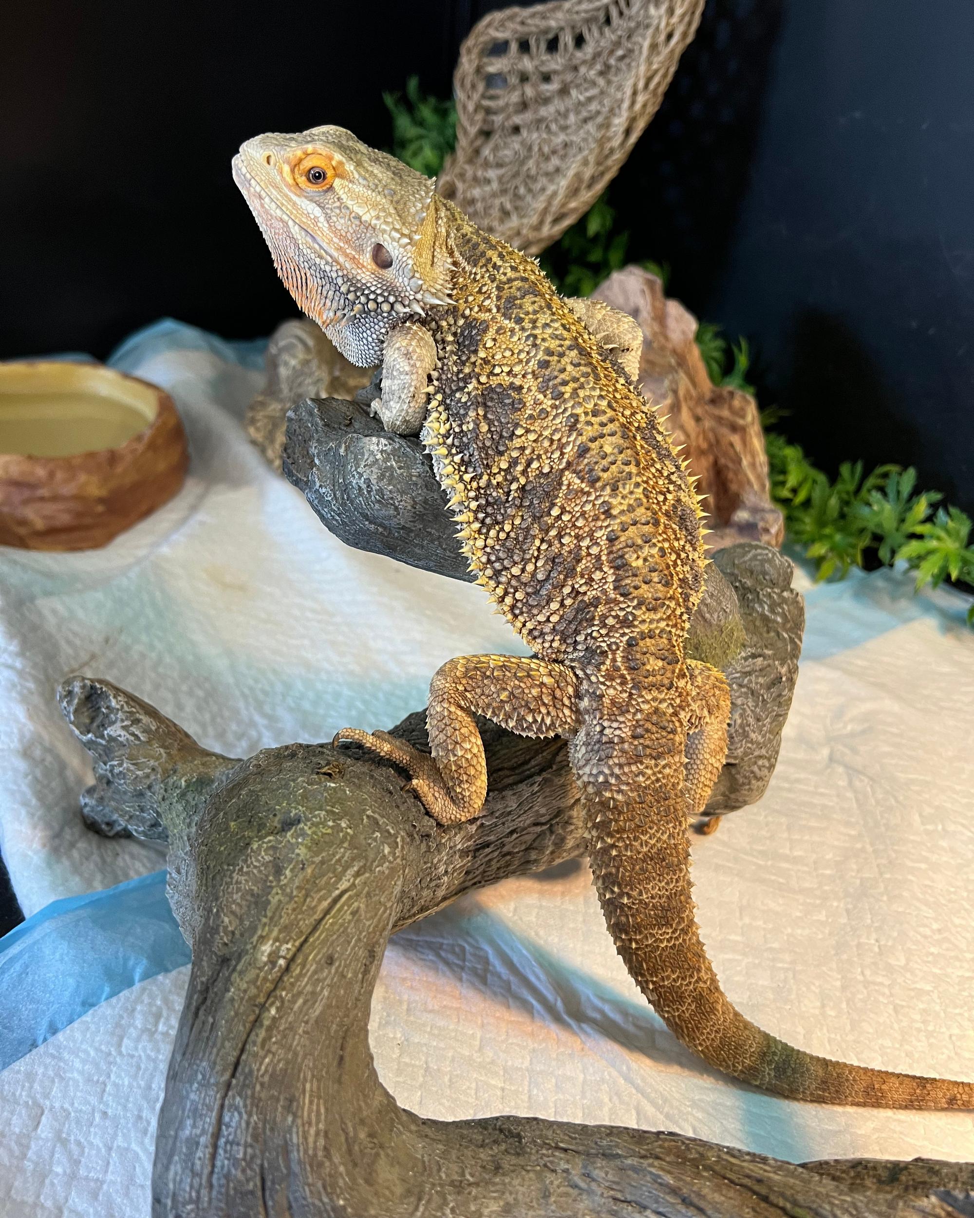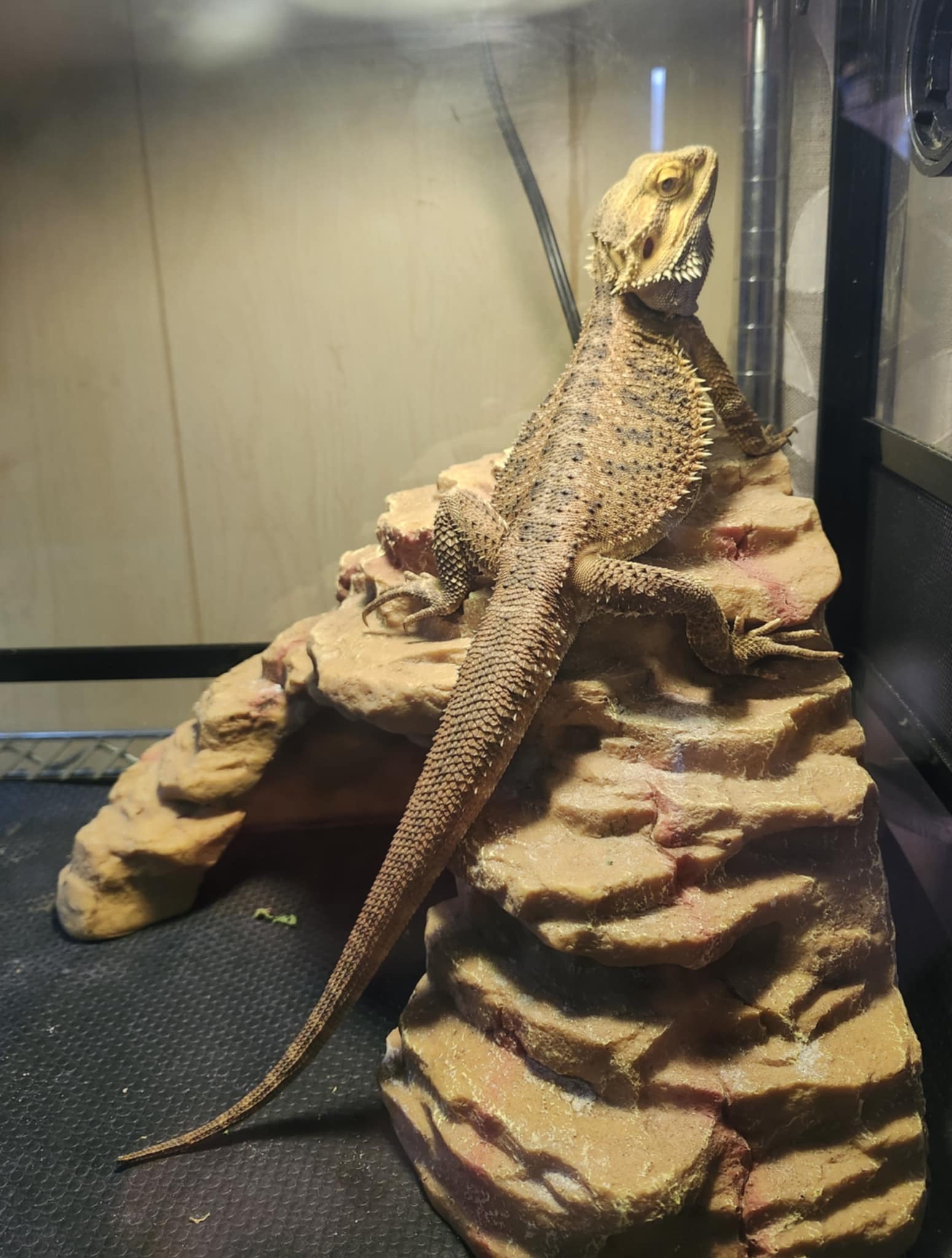 Meet RhreaRhea is a beautiful 2 year old dragon who is missing the tip of her tail. Likely from being housed with her siblings but she isn’t telling. She thinks it makes her mysterious. She is a good eater now that she has settled into her foster home; however, she prefers bugs to greens. She is an active adventurous girl who would like to explore more than she is allowed because her foster mom and her dogs are new to dragons and is worried about her safety as Rhea has no qualms about climbing on the dogs when they are in her way. Rhea will need a minimum of a 4x2x2 enclosure for adoption.
