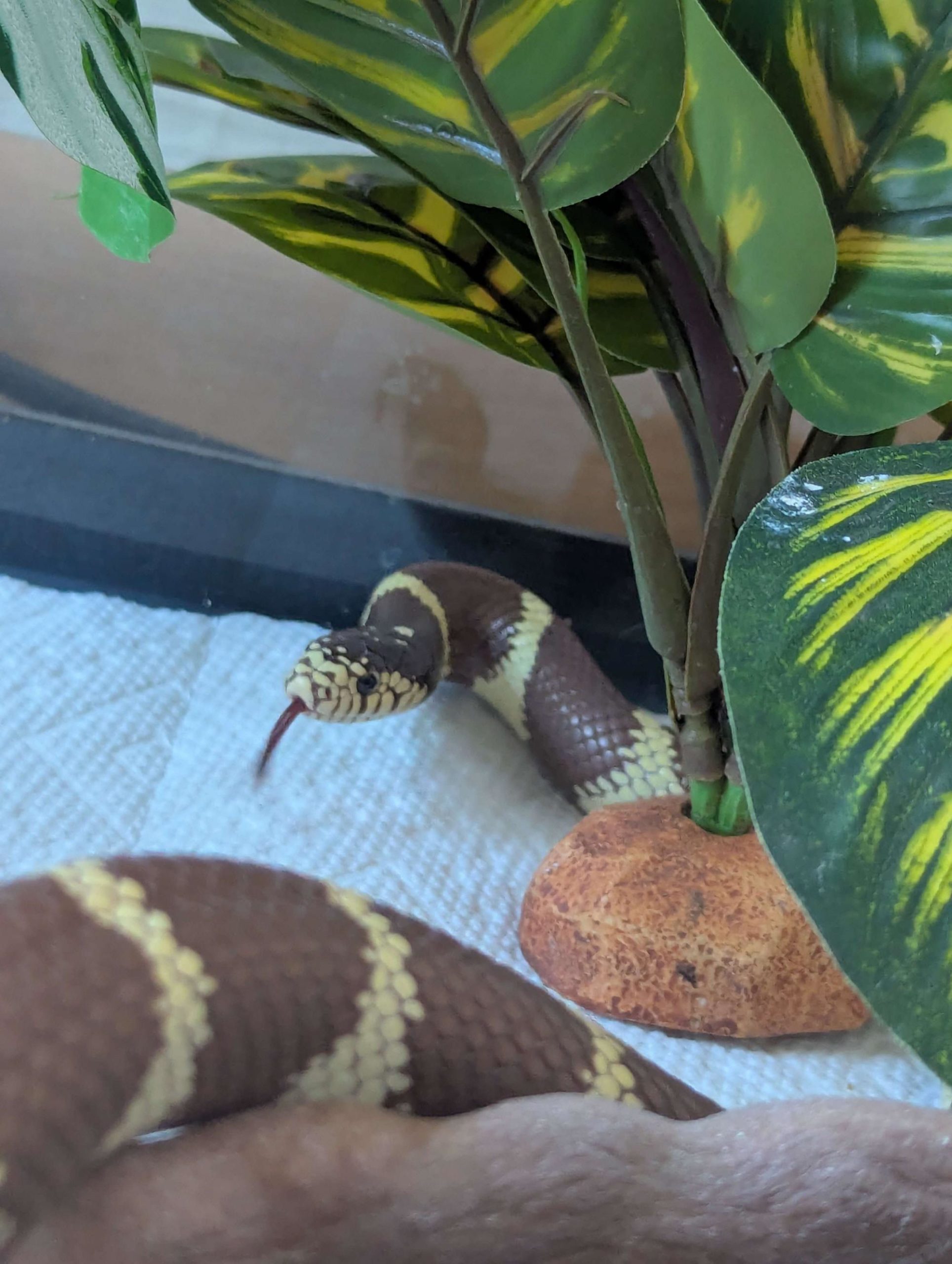 Meet Belle! Belle is a California king that lives up to their lifestyle of being a garbage disposal. She needs to be tong fed due to her missing her prey from excitement. Belle is a little on the chunky side and needs someone who will work on toning her up. She loves to explore, and is very tolerant of being handled. Clearly loved in her previous home, she is not afraid of humans at all. Belle loves to rearrange her enclosure in her foster home, so a bioactive enclosure with lots of clutter would be her ideal home. Belle will need a minimum of a 75 gallon enclosure for adoption.