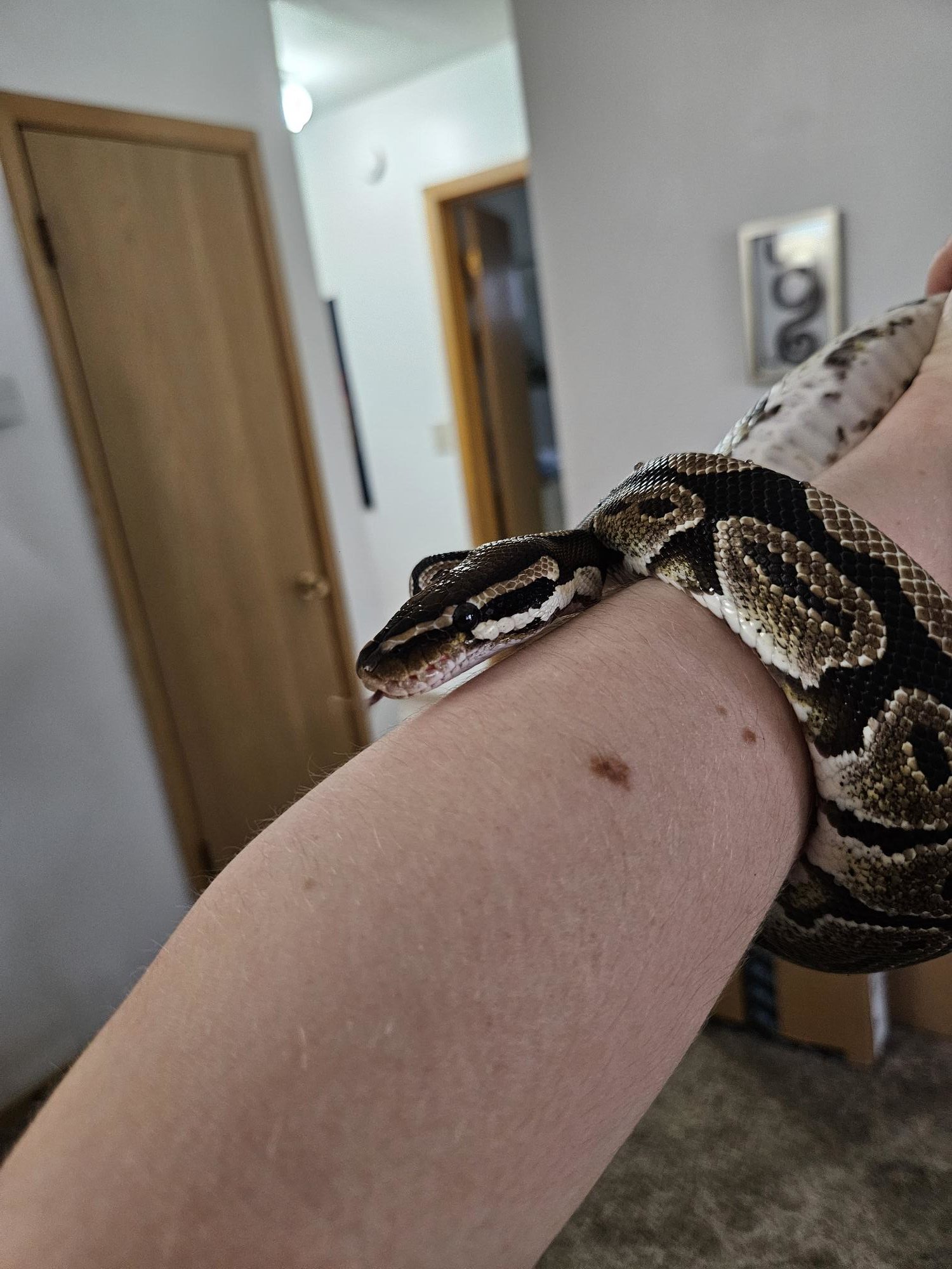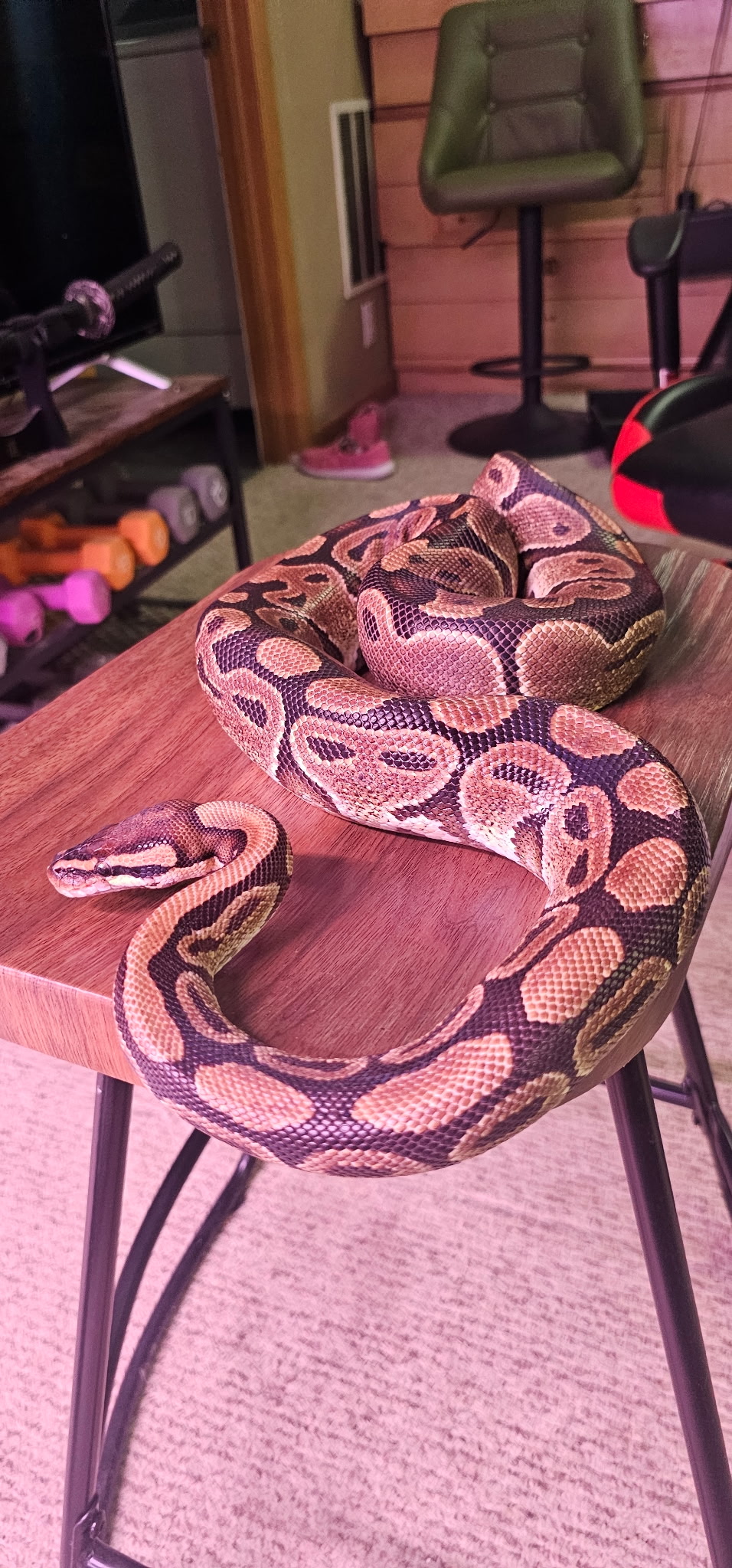 Meet Cronus! Cronus is a beautiful, large normal ball python who loves to be out and about, watching his humans take care of the house. He loves to eat, and has a relaxed personality. He would be a great ball python for a beginner owner, as long as they aren't against keeping a large snake! Cronus will need a minimum of a 4x2x2 for adoption, but preferably larger due to his size.