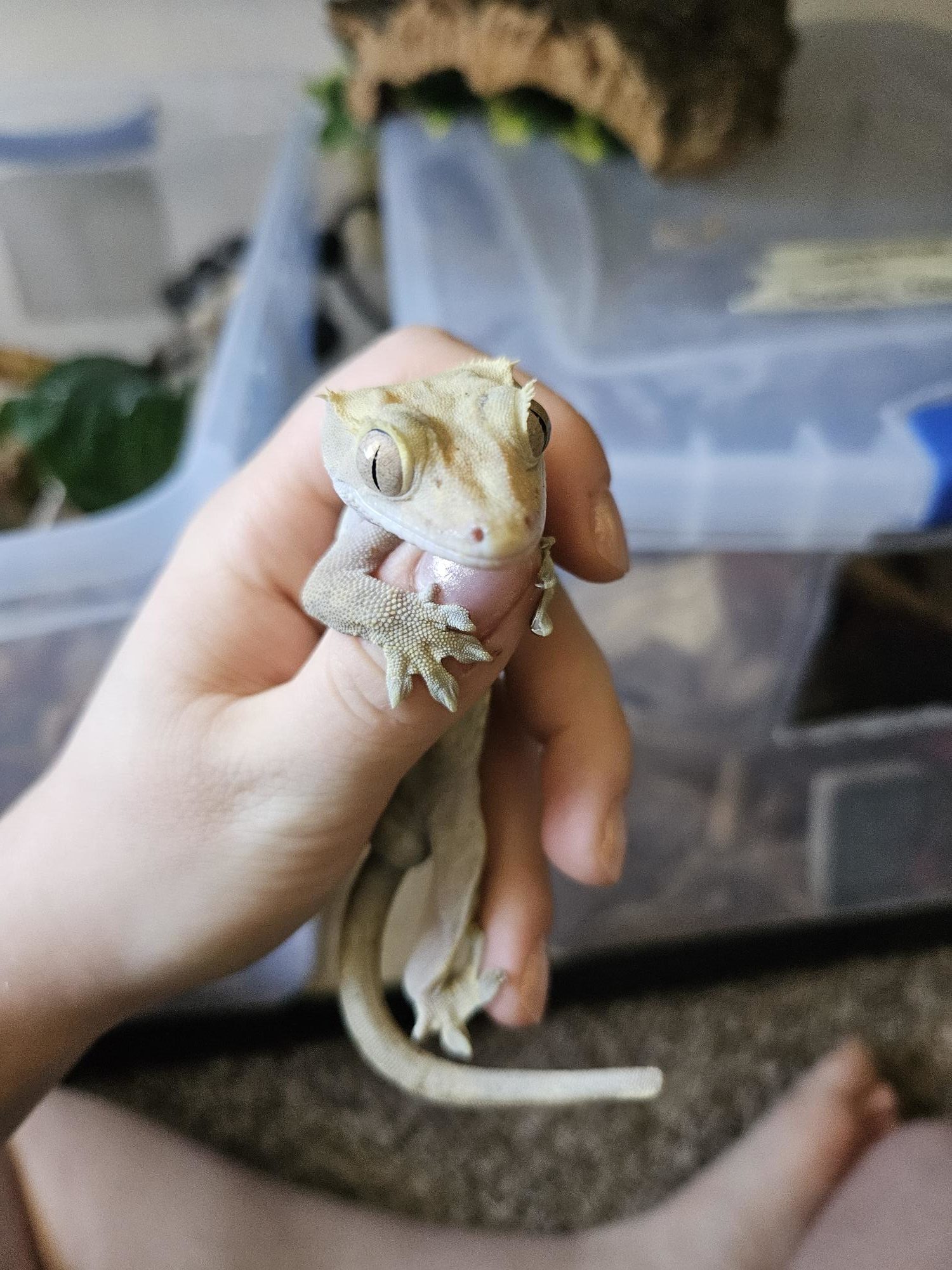 Meet Bonnie! Bonnie is a relaxed and quiet gecko and takes a while to warm up to people…but once you win her over, she is a sweetheart. Bonnie is more for someone who wants a “hang out” gecko that is less inclined to simply run off for exploration. Aka, a gecko who will watch TV with her person. Bonnie will need a minimum of a 40 gallon enclosure for adoption.