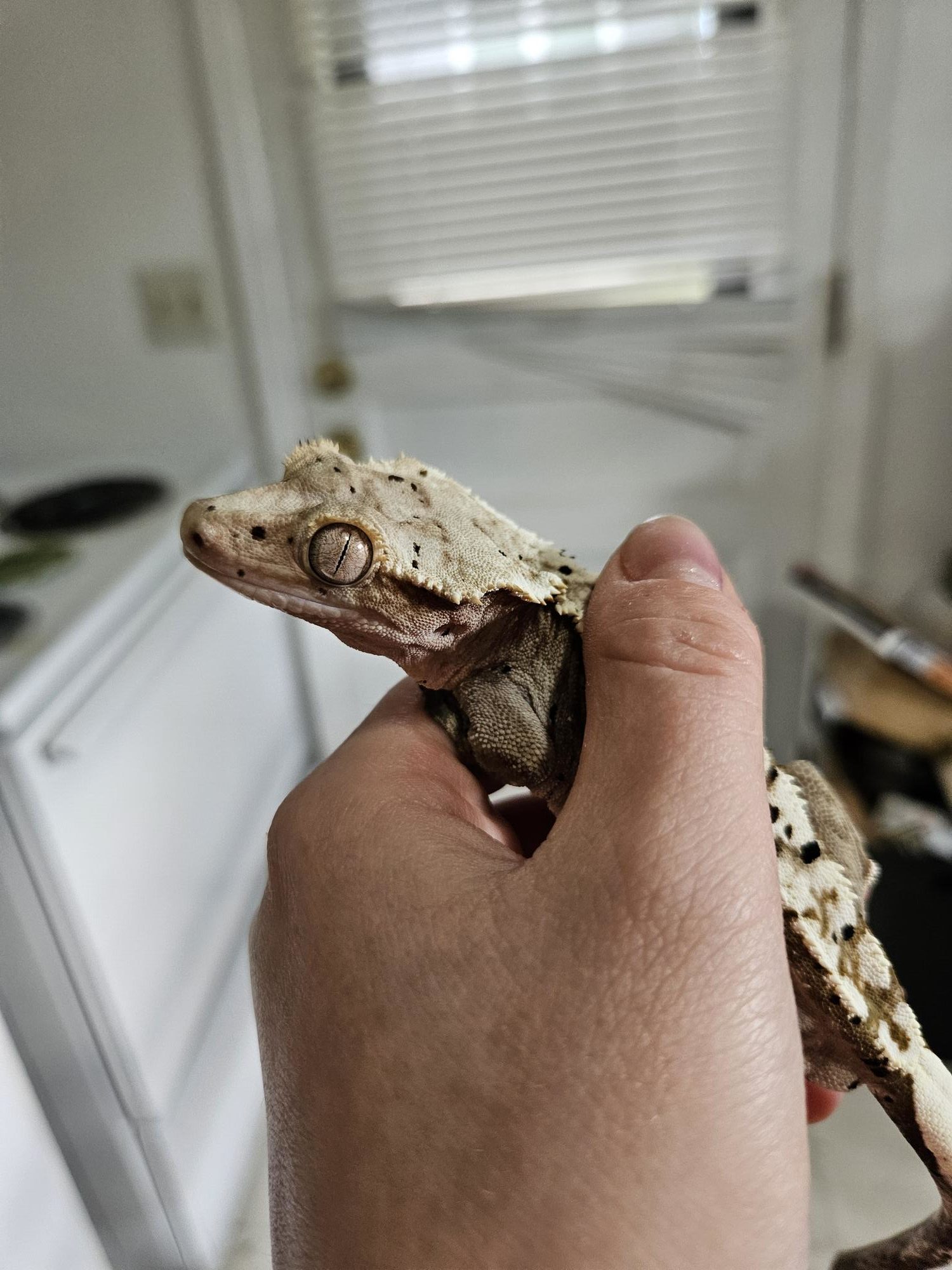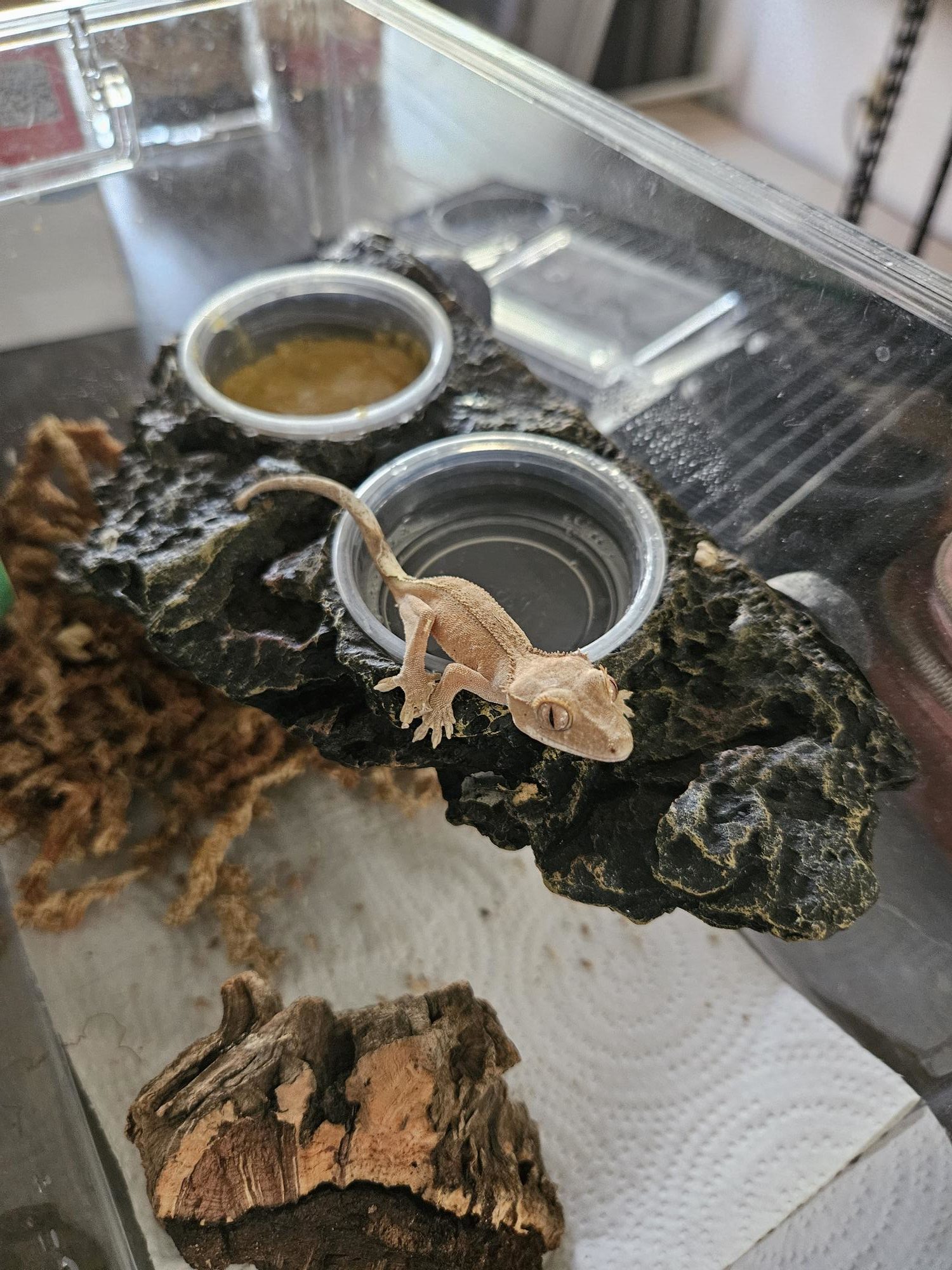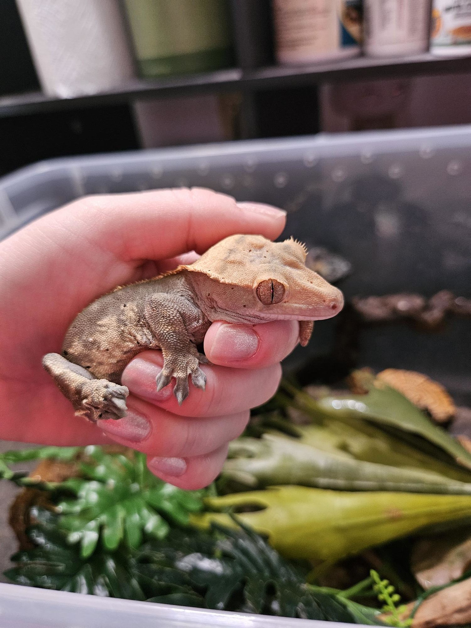 Meet Pecan! Pecan is a beautiful crestie who has a taste for hiding in plants and climbing up walls. He enjoys making you play hide and seek. Pecan is handleable, but tends to be skittish if he is caught without prior notice. He would love a heavily planted tank. His favorite pangea flavor is fig with insects. Pecan will need a 2x2x4 for adoption.